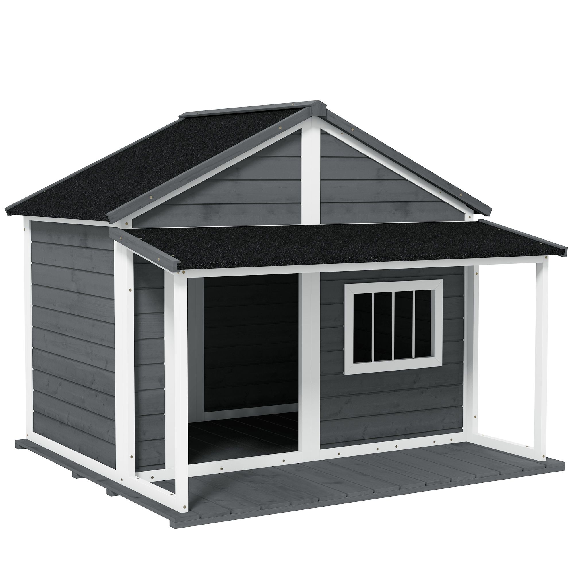 Make your dog feel at home even while outside with the PawHut big porch dog house. This cabin-style dog house has a large living room and a patio, so your pet will have space to rest while soaking up the sun. This dog house has a door, and side windows for comfortable air circulation. It also has an asphalt roof to protect your dog from weather, rain, or shine. Give your pet a stylish new home with a PawHut.