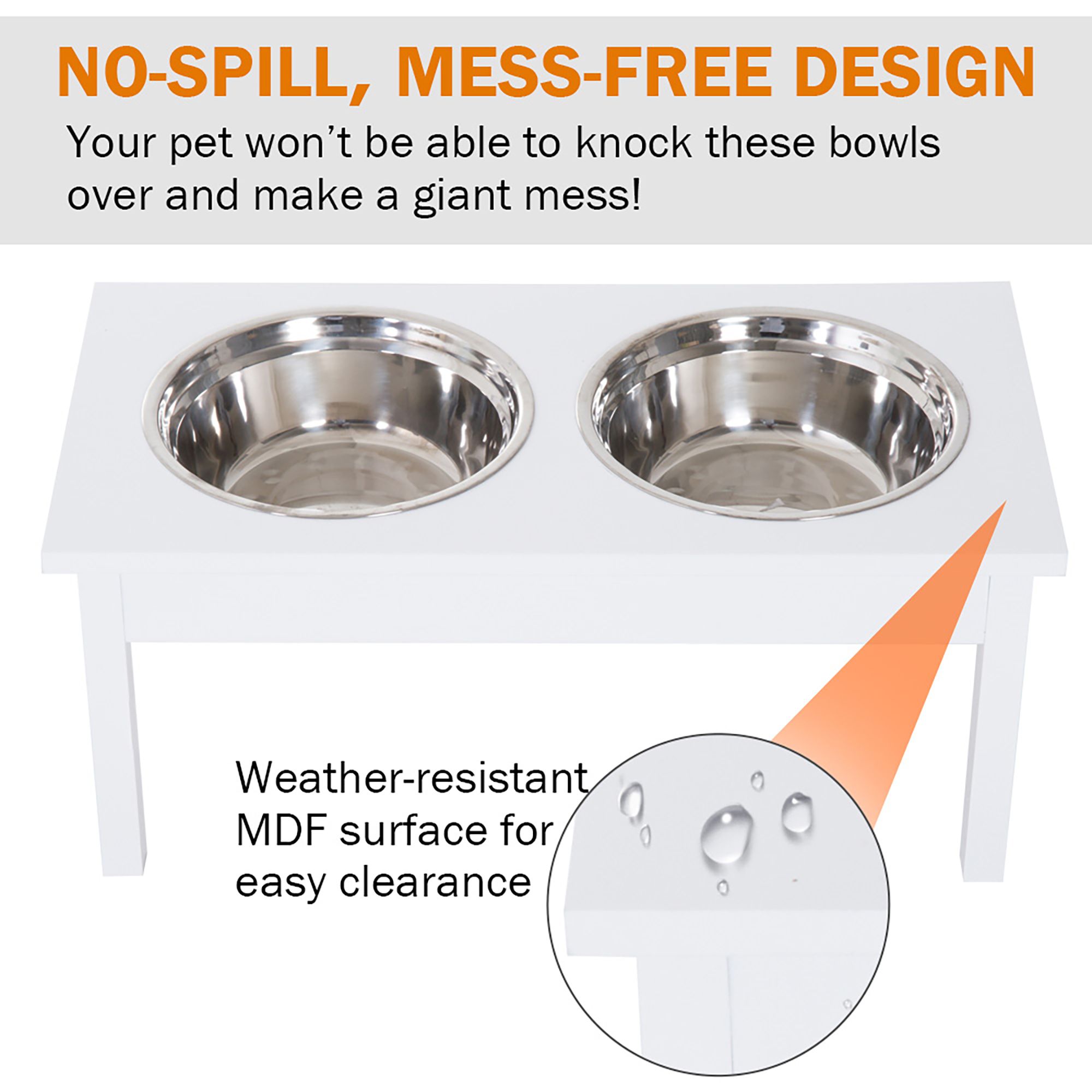 • - Stable Design: PawHut's heavy-duty dog food bowls and stand are constructed of engineered wood and stainless steel metal. Even if your furry friend is a messy eater, this elevated pet feeder stand will keep your floor clean.