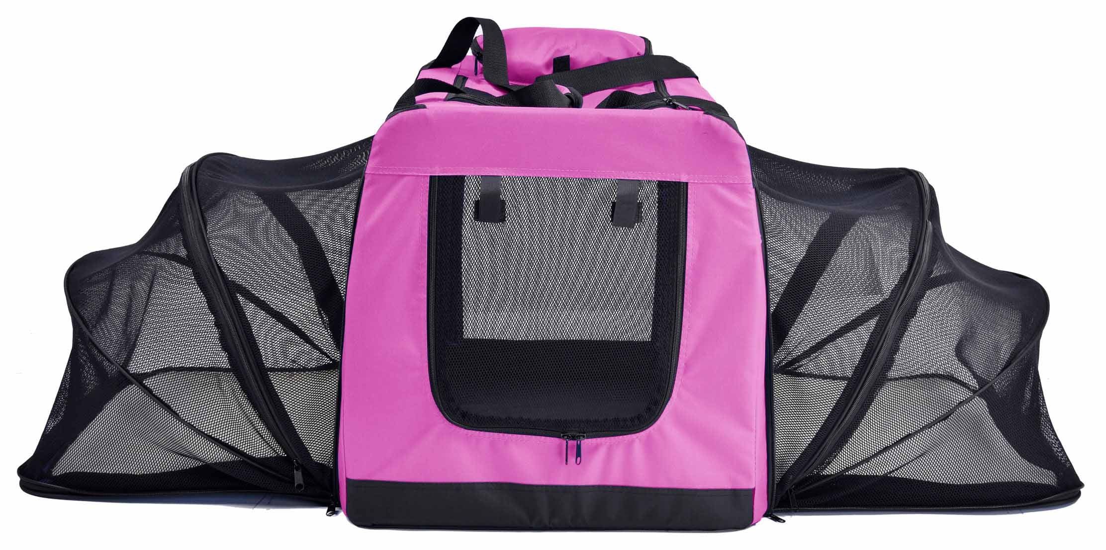 The Pet Life 'Hounda Accordion' Metal Framed Soft-Folding Collapsible Dual-Sided Expandable Pet Dog Crate is specially engineered with 3 times the lounging space. This soft folding crate features dual-sided zippers that zip open and expand on both sides like an accordion for a roomy triple lounging area experience with comfortable and breathable Sherpa-like removable resting pads that Velcro in place on each side. Both accordion-like expandable sided mesh structures feature zippers for additional pet placement. The Hounda Accordion pet crate is composed of a Durable Nylon Exo-Shell and Premium breathable mesh with a Medium-weight sturdy metallic frame that completely folds, collapses and buckles closed into place and locks into place when opened. This crate also features a zippered above-top pouch for placement of belongings and zippered frontal and panoramic entrances for easy pet placement that zips open, rolls up and Velcro's into place while offering complete ventilation and Sunview all around. Additionally this crate features above handle straps for easy carrying and a built-in safety leash holder. Spacious enough for multiple pets and perfect for travel and outdoor areas. Available in Multiple Colors and Sizes.
